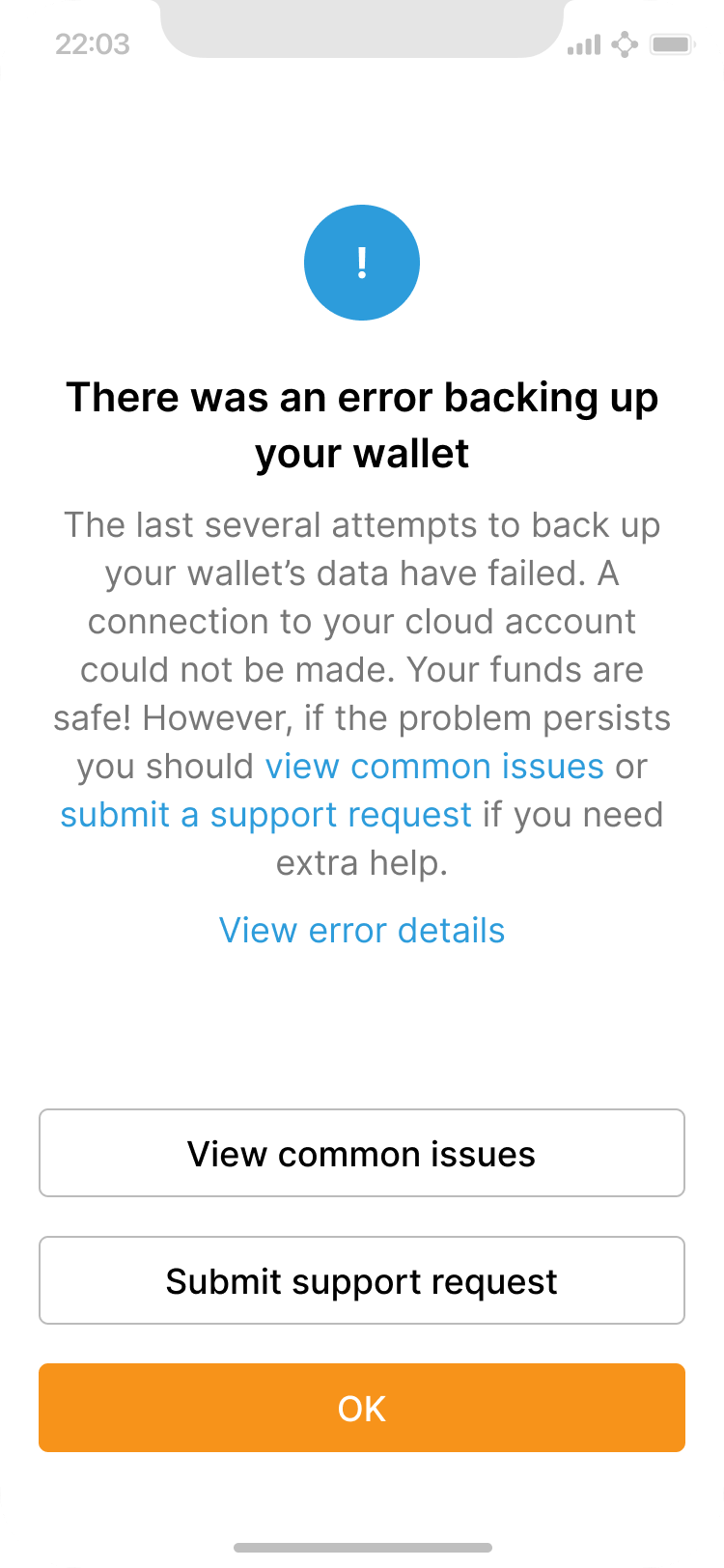 In normal conditions, this wallet performs an automatic cloud backup after sending or receiving any payment. However, there could be situations where this fails to happen, such as an error or outage on the side of the cloud provider. Regardless of the reason, it’s good to notify the user if there is a problem. This wallet offers a list of common issues and solutions, and also offers the ability to submit a support request.
