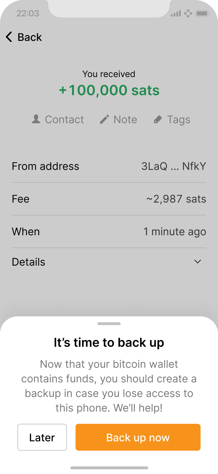 As mentioned in the previous section, this wallet prompts the user to back up during First Use and, if they opt-out, reminds them again once they have received funds.