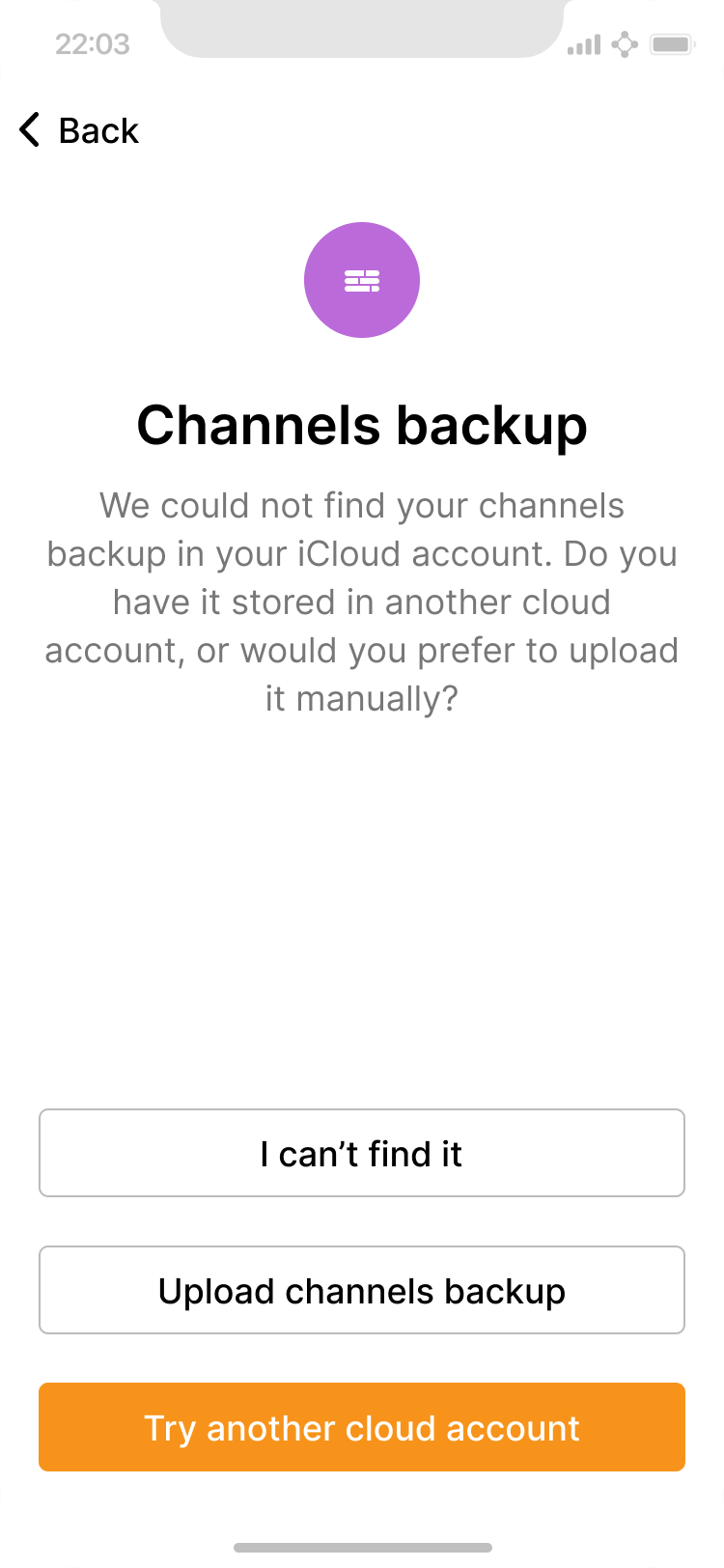 The app fails to automatically find a channel state backup in the user’s cloud account. User chooses "I can’t find it".