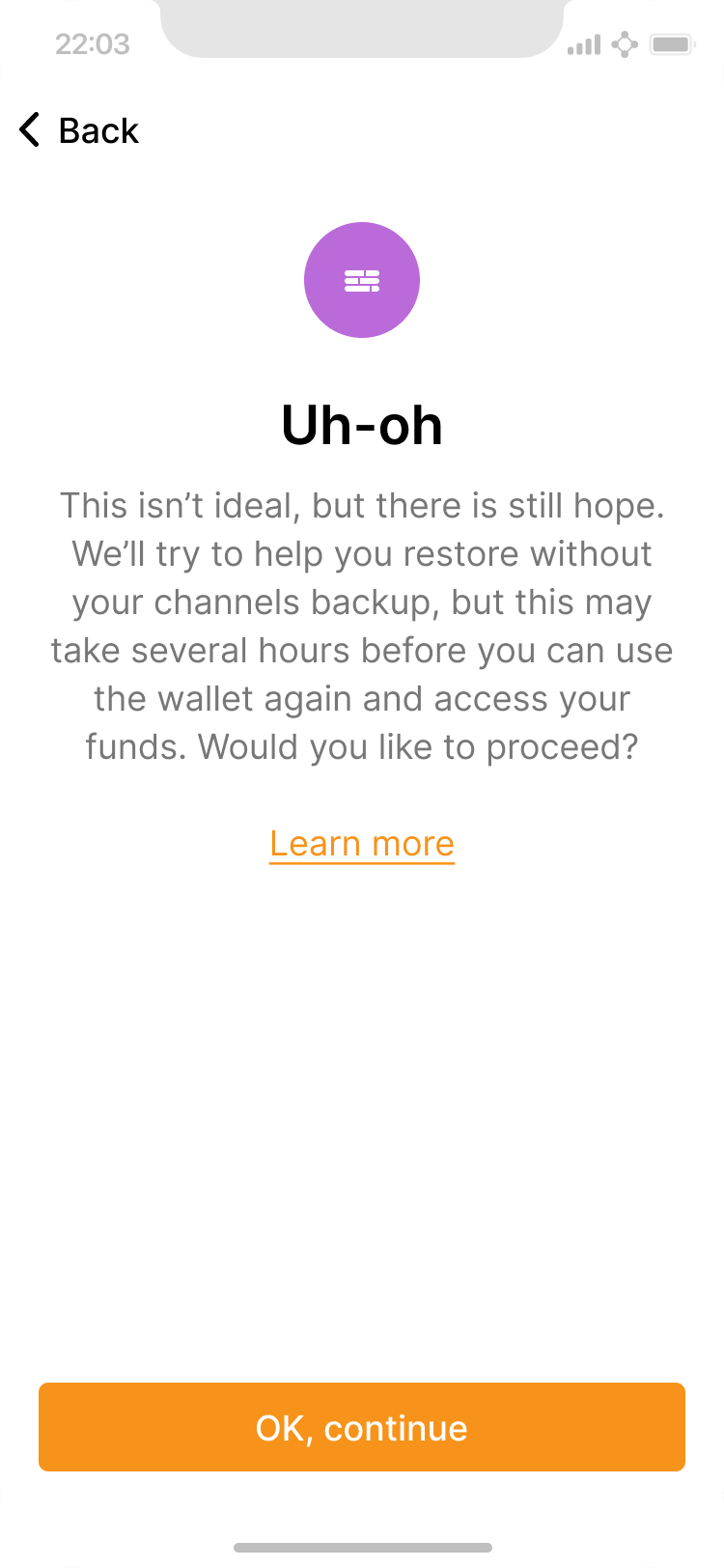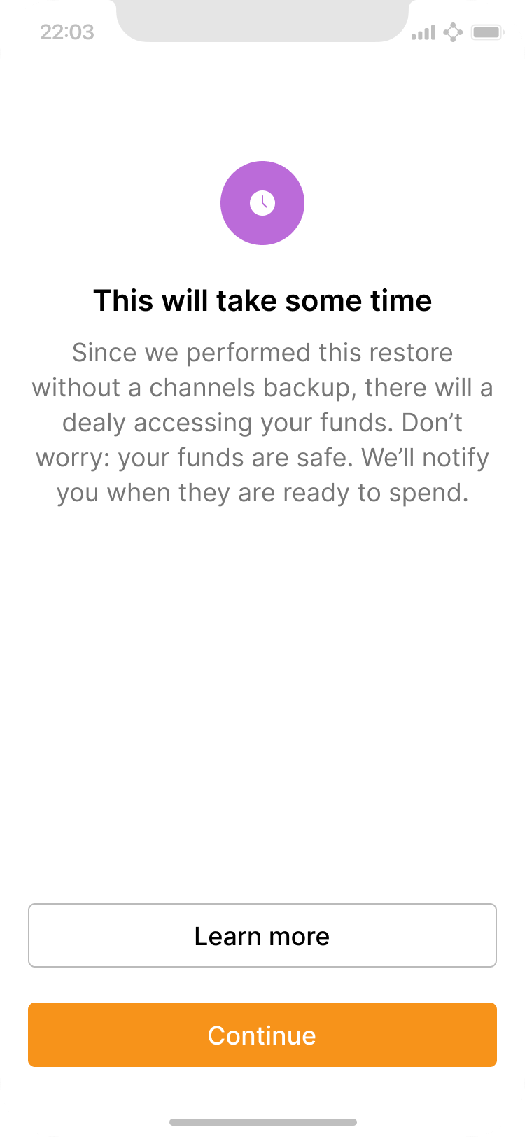 The app offers to help the user restore anyways, but warns that there will be a delay in accessing funds.