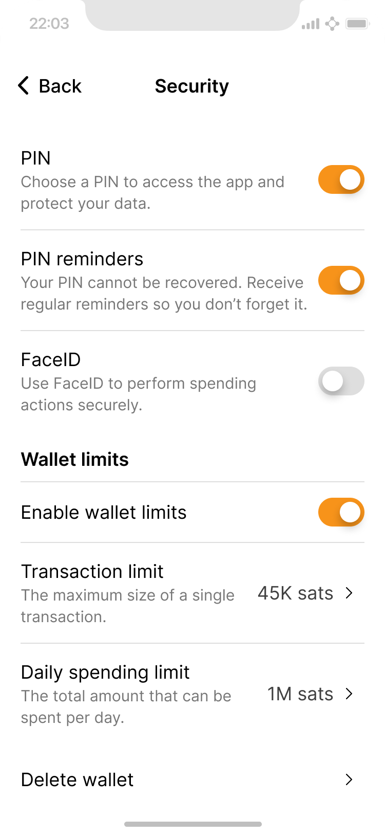 Security is all about preventing unwanted access to the application. Basic access options (PIN, FaceID) are configured during first use, and users receive regular reminders to review them. Wallet limits are an additional option, only available in settings, to block potentially unwanted high-value payments.