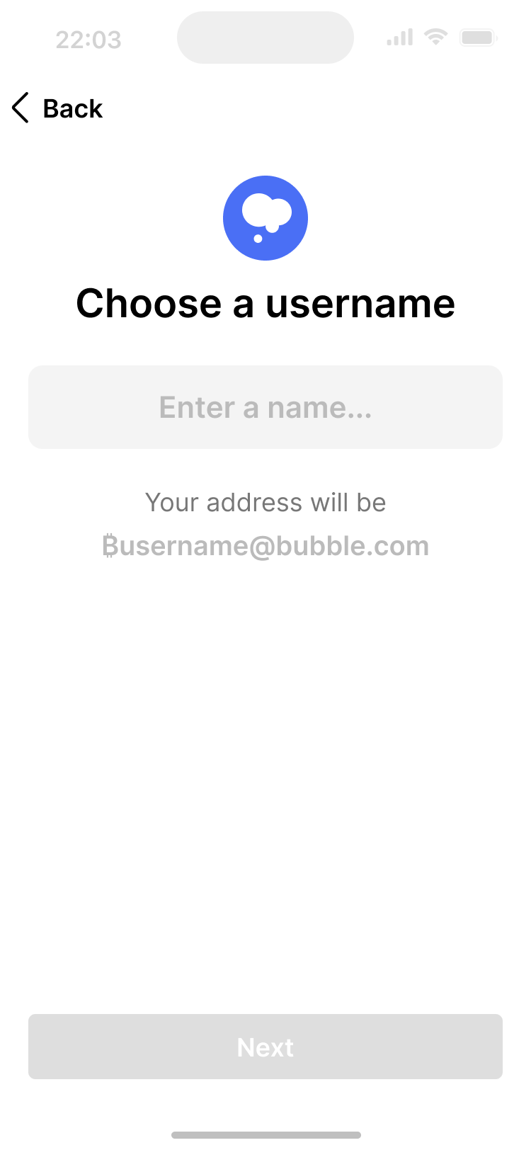 The mock-ups below show an imaginary application called “Bubble Wallet”. Its naming conventions are based on the idea that Human Bitcoin address is an appropriate descriptive term for technical proposals and discussions, and can also be used contextually and subtly in product UI where appropriate—for example, in titles, labels, and input-field placeholders. Due to the similarities to the familiar email format and social media practices, it borrows from those standards.
